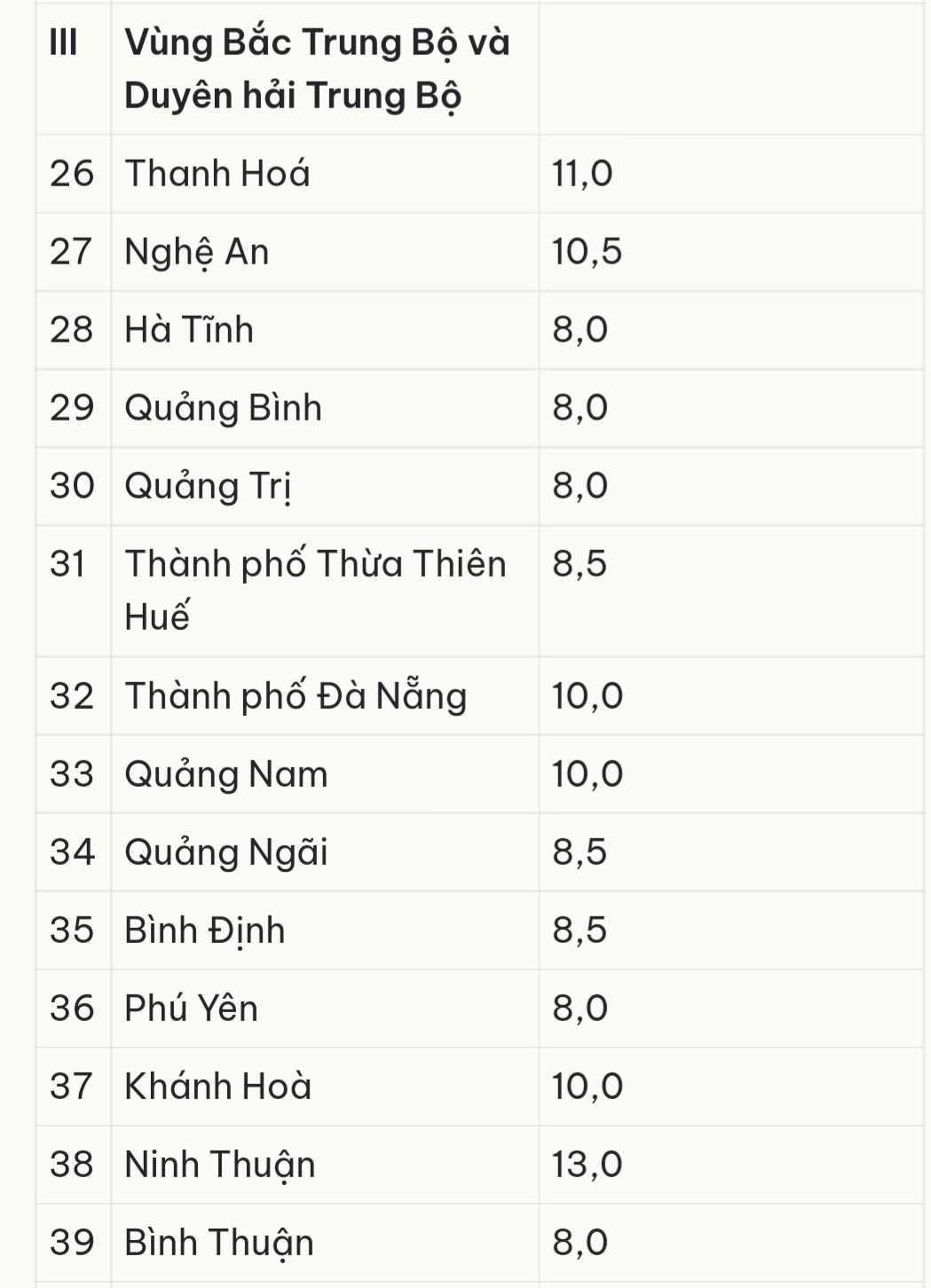 Tại vùng Bắc Trung Bộ và Duyên hải Trung Bộ, tỉnh Ninh Thuận được giao chỉ tiêu cao nhất với 13%, kế tiếp là tỉnh Thanh Hoá 11%, Nghệ An 10,5%; các tỉnh Quảng Nam, Khánh Hoà, TP Đà Nẵng...