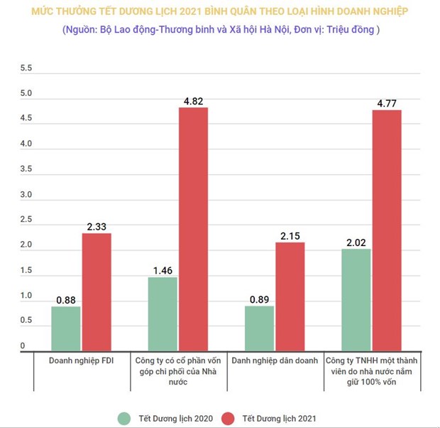 Lãnh đạo Bộ Lao động-Thương binh và Xã hội cho biết sở dĩ mức thưởng Tết Dương lịch tăng cao so với năm 2020 là do nhiều doanh nghiệp hỗ trợ thêm cho người lao động trong bối cảnh đời sống của người lao động chịu ảnh hưởng tiêu cực của đại dịch COVID-19. Điều này thể hiện sự chia sẻ của doanh nghiệp đối với một năm bị giảm giờ làm, giảm thu nhập của người lao động.