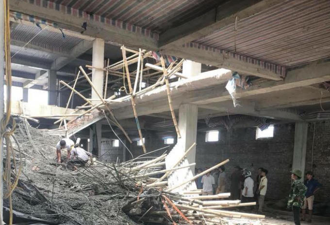 Tại hiện trường, một phần giàn giáo bê tông của cầu thang lên tầng 2 của công tình bị sập, sắt thép và vật liệu xây dựng cùng với máy móc nằm ngổn ngang.