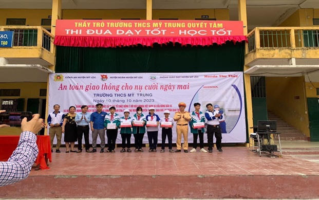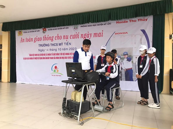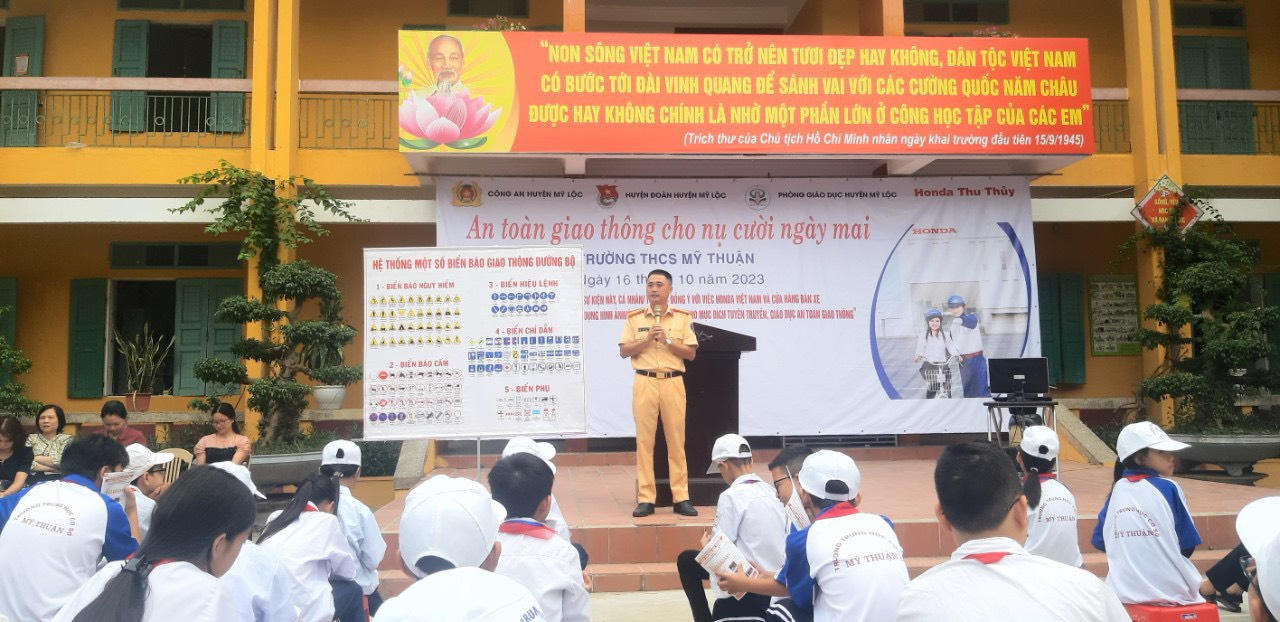 Thực hiện chương trình công tác Đoàn, Đội và phong trào thanh thiếu nhi năm học 2023 – 2024; Căn cứ Kế hoạch liên ngành số 123-KHLN/ĐTN-PGD-CTYTT ngày 09/6/2023 giữa Ban Thường vụ Huyện đoàn, Phòng Giáo dục Đào tạo huyện và Công ty TNHH Thu Thủy về việc tổ chức tư vấn lái xe an toàn và triển khai chương trình “An toàn giao thông cho nụ cười ngày mai”. Nhằm tuyên truyền, nâng cao kiến thức về ATGT trong trường học, từng bước hình thành văn hóa tham gia giao thông trong học sinh khối trường học. Công an huyện, Phòng GD&ĐT huyện, Huyện đoàn Mỹ Lộc, Công ty TNHH Thu Thủy, đã phối hợp tổ chức tuyên truyền, phổ biến giáo dục pháp luật về trật tự ATGT cho các cán bộ, giáo viên và học sinh khối trường THCS, THPT, Trung tâm GDNN – GDTX trên địa bàn huyện.
