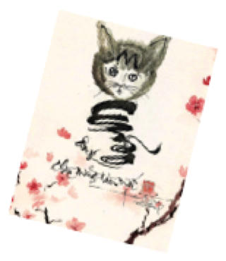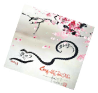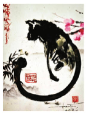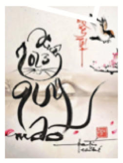 4 Tự hoạ “ Mèo phúc lạc” với tư thế ngồi vững chãi, khỏe khoắn, an lạc, ngắm nhìn dòng chữ “Chúc mừng năm mới”. Đặc biệt, bằng nét bút nhanh như chớp dứt khoát, mãnh liệt ở đuôi mèo tạo nên nội lực và rất có hồn, chữ “mèo” được ẩn trong thân Mèo, trông rất huyền bí. Đây là thủ pháp thủy mặc, anh sử dụng độ loang của mực tàu, tạo nên những mảng màu sáng tối rất tự nhiên và nghệ thuật.