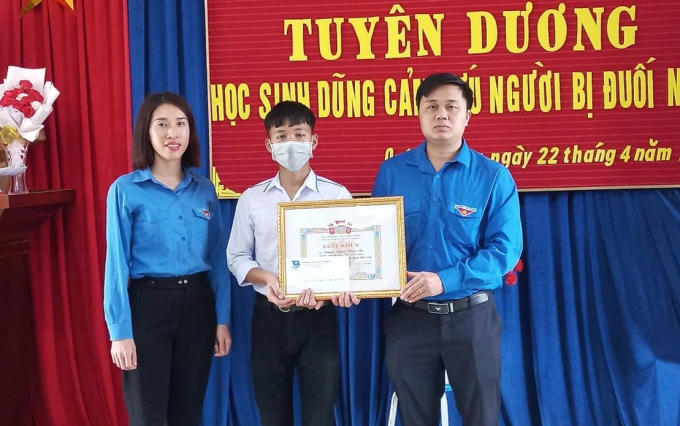Ngày 23/4, huyện đoàn Quỳnh Lưu, Nghệ An cho biết vừa tặng giấy khen và tuyên dương em Đặng Ngọc Thái An (lớp 9D, trường THCS Quỳnh Hồng, huyện Quỳnh Lưu) vì hành động dũng cảm cứu sống một học sinh lớp 1 bị đuối nước dưới hồ sen.