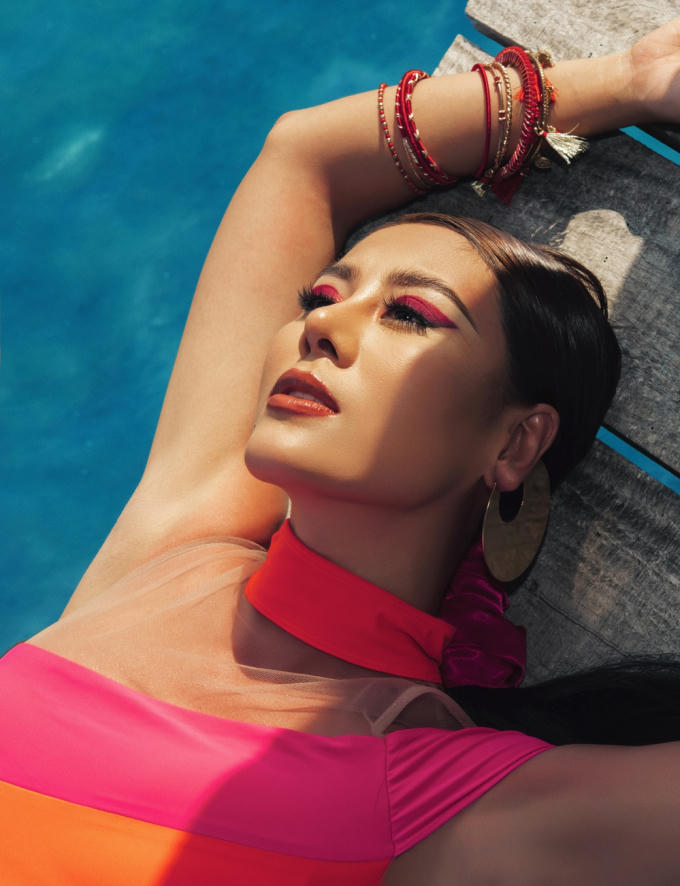 Trong bộ ảnh mới, “kiều nữ làng hài" diện những mẫu áo tắm cắt xẻ táo bạo, khoe vóc dáng săn chắc khiến nhiều người ngưỡng mộ.