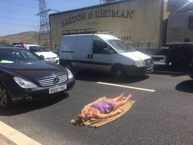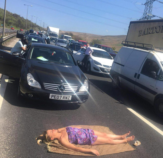 Vào cuối tuần vừa qua, một vụ cháy bình chứa ô xi ở Anh đã khiến giao thông trên đường M62 tắc nghẽn suốt 3 giờ đồng hồ. Mọi người đều mệt mỏi, phàn nàn nhưng Lily Willets 27 tuổi lại làm một điều không tưởng, đó là trải chăn ra lòng đường để tắm nắng trong khi chờ đợi.