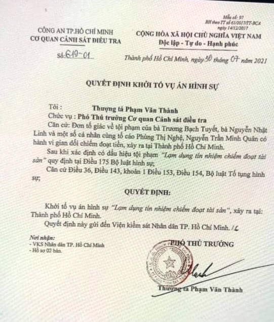Căn cứ vào Đơn tố giác về tội phạm của bà Trương Bạch Tuyết, bà Nguyễn Nhật Linh và một số cá nhân cùng tố cáo Phùng Thị Nghệ, Nguyễn Trần Minh Quân có hành vi gian dối chiếm đoạt tiền, xảy ra tại TP HCM. Sau khi xác định có dấu hiệu tội phạm “Lạm dụng tín nhiệm chiếm đoạt tài sản” quy định tại Điều 175 Bộ luật Hình sự; Căn cứ Điều 36, Điều 143, khoản 1 Điều 154 Bộ Luật Tố tụng hình sự, cơ quan Công an TP HCM đã ban hành quyết định khởi tố vụ án.
