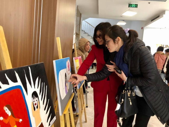 Các đại biểu tham quan trưng bày tranh của NKT đạt giải cuộc thi vẽ về bình đẳng giới và phòng, chống bạo lực gia dình.