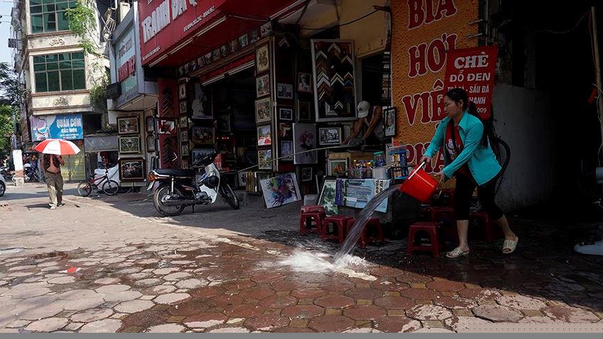 Xả nước trước hiên nhà để hạ nhiệt.
