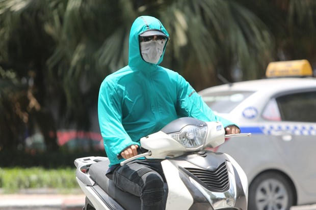Người dân ra đường với trang phục kín mít để tránh cái nắng gay gắt. (Ảnh: Thành Đạt/TTXVN)