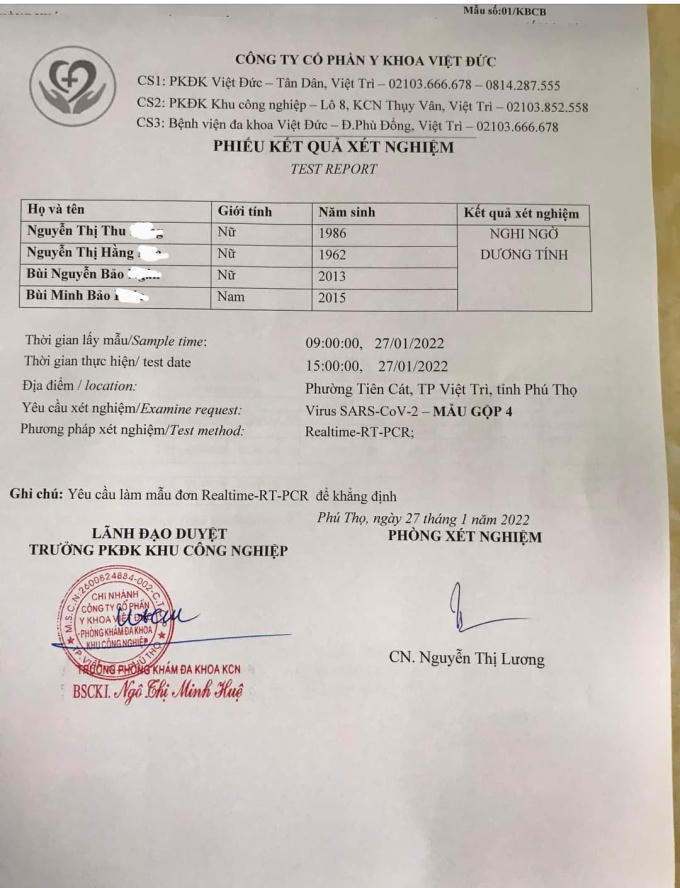 Vẫn không chắc chắn rằng kết quả xét nghiệm Covid-19 theo phương thức PCR tại Bệnh viện đa khoa Việt Đức là chính xác, gia đình chị Hằng đã tới Bệnh viện Đa khoa tỉnh Phú Thọ test lại mẫu đơn PCR thì lại cho kết quả ÂM TÍNH cả 4 người!!!