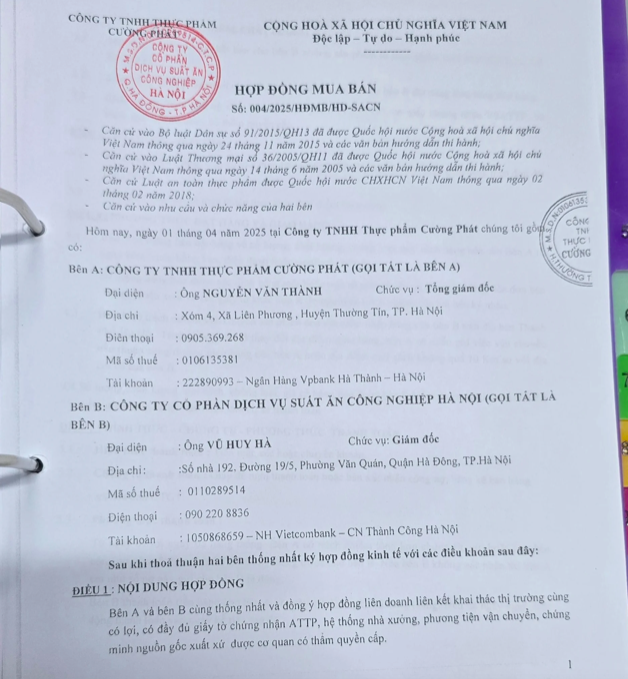 Hợp đồng mua bán thực phẩm với nhiều đơn vị trong đó có hợp đồng mua bán thịt lợn với Công ty TNHH Thực phẩm Cường Phát; ngoài ra hồ sơ còn có danh sách mã QR truy xuất nguồn gốc thịt từ doanh nghiệp này.