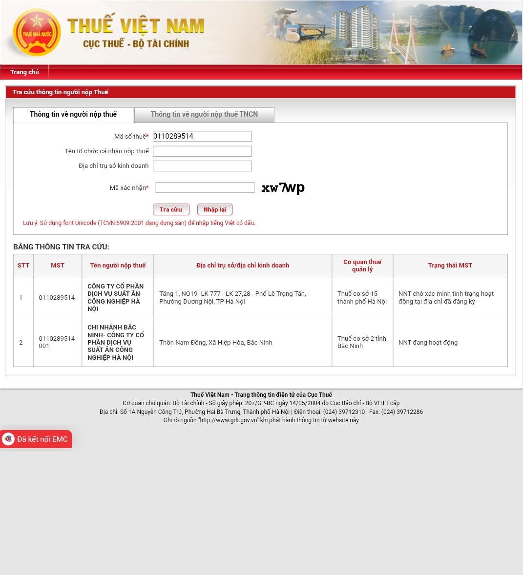 Trong khi đó, tra cứu mã số thuế 0110289514 của Công ty cổ phần dịch vụ suất ăn công nghiệp Hà Nội trên Cục thuế của Bộ Tài chính lại thể hiện thông tin địa chỉ Tầng 1, NO19- LK 777 - LK 27, 28 - Phố Lê Trọng Tấn, Phường Dương Nội, Thành phố Hà Nội đang có trạng thái mã số thuế là người nộp thuế chờ xác minh tình trạng hoạt động tại địa chỉ này.