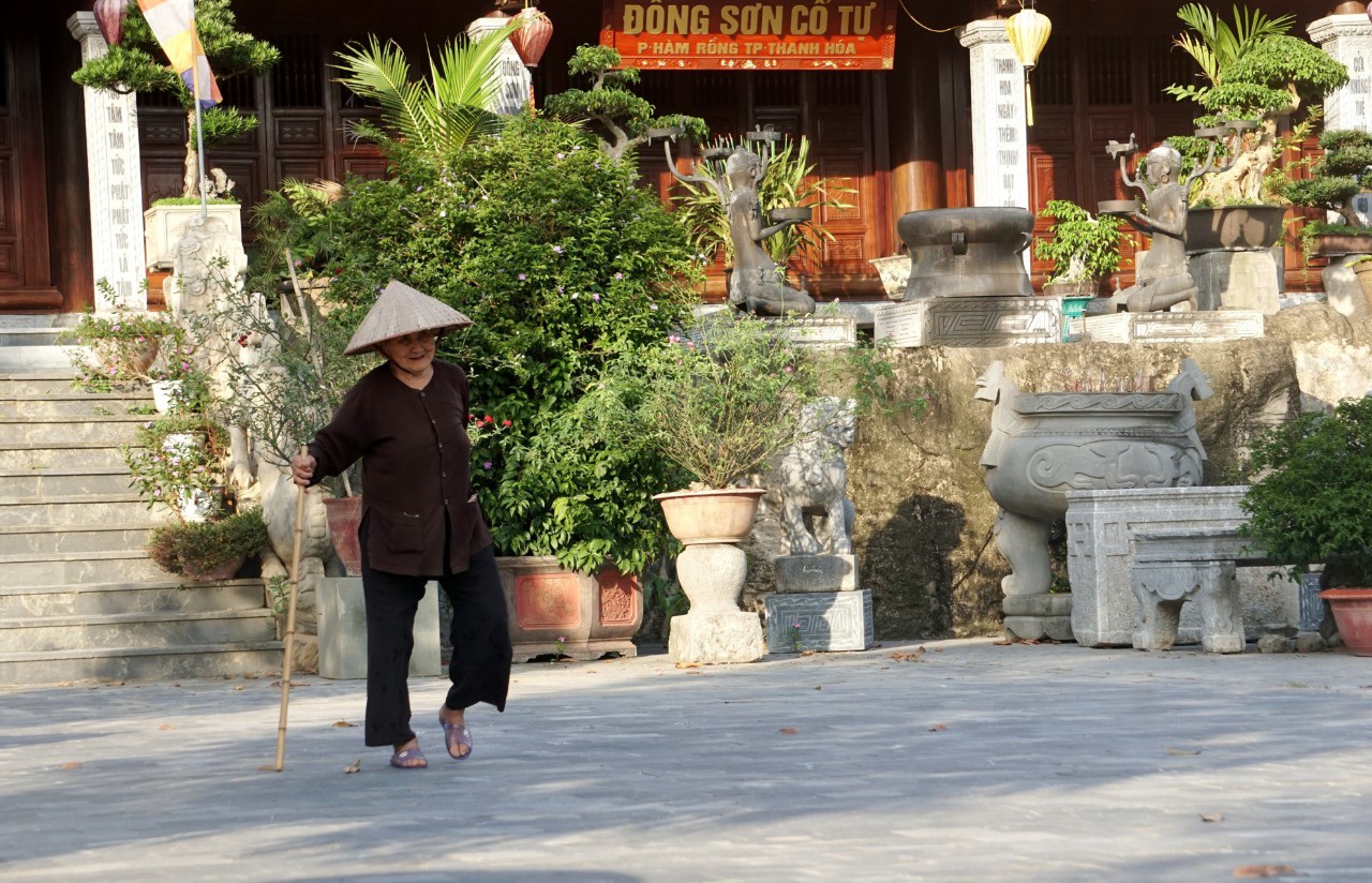 Với không gian yên tĩnh, cuộc sống bình dị, ở làng Đông Sơn có rất nhiều cụ cao niên có tuổi xưa nay hiếm nhưng còn khá minh mẫn. Trong ảnh là cụ Dương Thị Đằng (92 tuổi), mỗi buổi chiều cụ Đằng thường ra sân chùa để đi dạo, hóng mát.