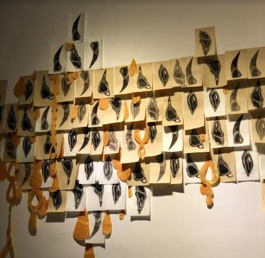 Bên cạnh đó, triển lãm “Vảy | Mực” còn trưng bày tác phẩm sắp đặt “Giáp Mực”, được kết thành từ 320 bản in lino trên giấy dó, giấy kozo Nhật và giấy vàng mã. Trên mỗi tấm giấy, Kenny đã chọn in nổi hình ảnh tượng trưng cho các tế bào làm nên lớp vảy cá dưới ống kính hiển vi.