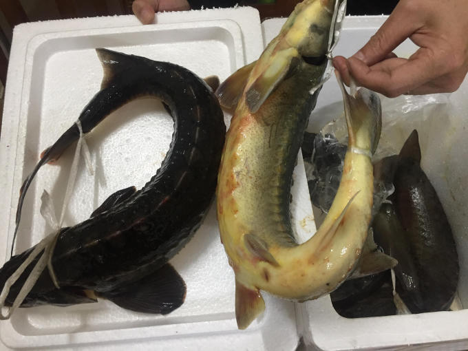 Đây là những con cá tầm được nuôi tại Lào Cai. Theo ông Nguyễn Thanh Hải, cá tầm trong nước chỉ từ 1,5 - 2kg đã được xuất bán, có màu sắc "khôn mắt" chứ không to và đen xì như cá tầm lai nhập lậu từ Trung Quốc