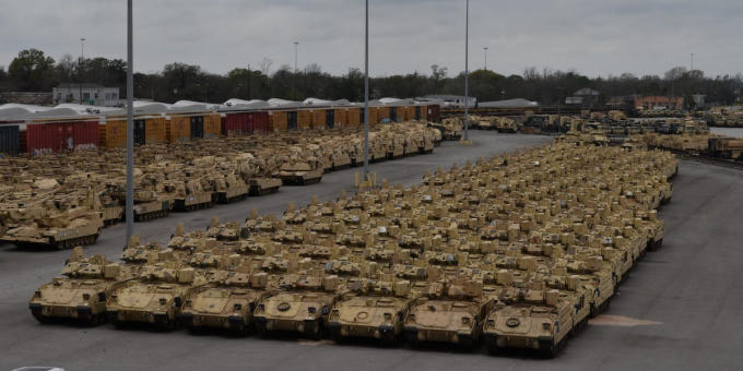 Phương tiện bọc thép của Mỹ chuẩn bị lên tàu sang châu Âu tham gia cuộc tập trận "Người bảo vệ châu Âu 20" ngày 18/2. Ảnh: BusinessInsider/US Army