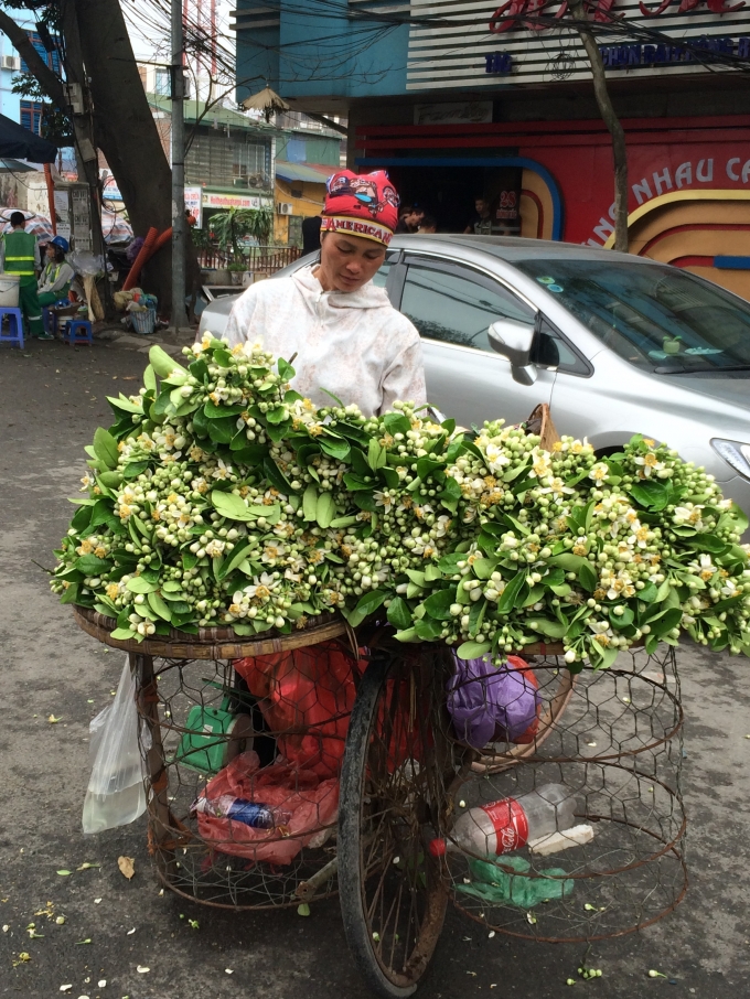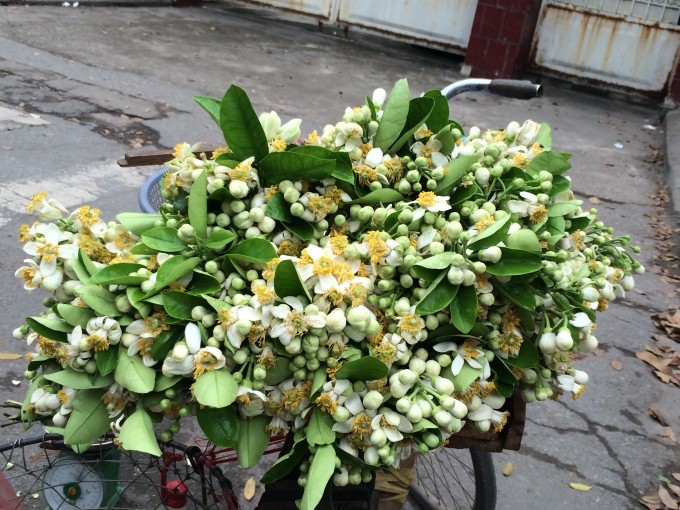 | Hoa bưởi khoe sắc giữa đường phố Hà Nội qua các gánh hàng rong. |