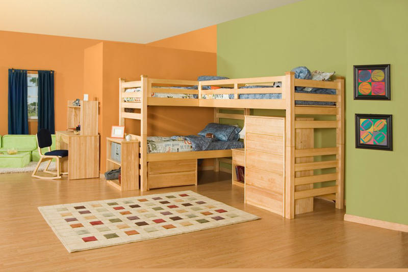 Những chiếc giường tầng màu vàng được kê trong không gian căn phòng khá rộng, với nền tường màu cam và xanh lục.