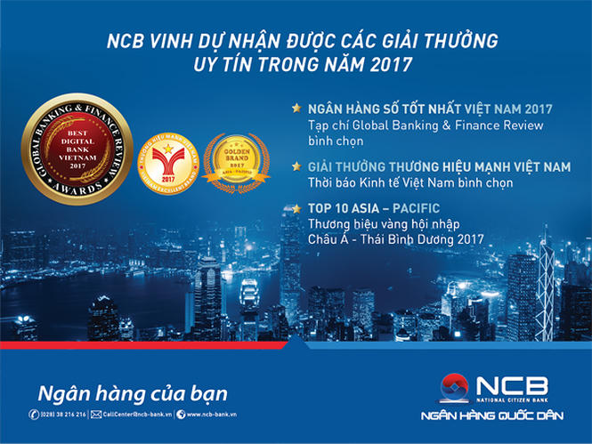Ngân Hàng TMCP Quốc Dân (NCB) liên tiếp nhận 2 Giải thưởng Quốc tế danh giá Ngân hàng Số tốt nhất Việt Nam 2017 (Best Digital Bank Vietnam 2017) và Giải thưởng Top 10 Thương hiệu Vàng Hội nhập Châu Á – Thái Bình Dương 2017 (Top 10 Asia - Pacific Golden Brand 2017).