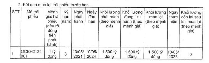 Vào ngày 10/5/2023, OCB đã thực hiện mua lại trước hạn toàn bộ 1.500 tỷ đồng trái phiếu đang lưu hành của mã OCBH2124001.