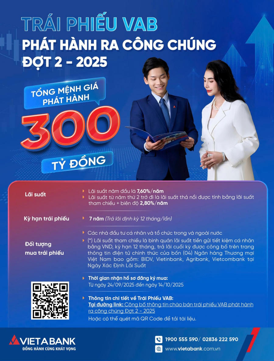 Căn cứ theo Giấy chứng nhận đăng ký chào bán trái phiếu ra công chúng số 228/GCN-UBCK do Chủ tịch Ủy ban Chứng khoán Nhà nước cấp ngày 03/7/2025 và Công văn số 5342/UBCK-QLCB của Ủy ban Chứng khoán Nhà nước ngày 17/9/2025 về việc tài liệu báo cáo chào bán trái phiếu ra công chúng Đợt 2 của VAB. Ngân hàng TMCP Việt Á (“VAB”) công bố thông tin về việc phát hành trái phiếu ra công chúng năm 2025 - Đợt 2 như sau: