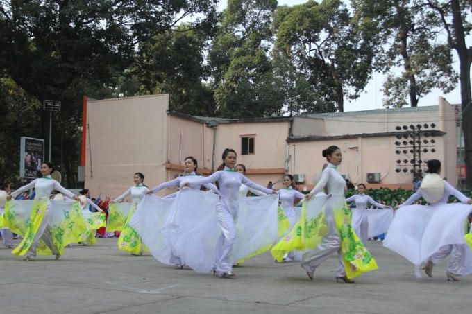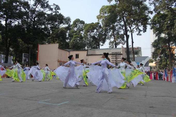 Sáng ngày 8/3, trong không khí vui tươi ngày Quốc tế Phụ nữ, hơn một nghìn người cùng diện áo dài tham gia lễ khai mạc và đồng diễn áo dài tại Nhà văn hóa Thanh niên (quận 1, TP HCM).