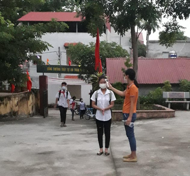 Tất cả học sinh khi đến trường đều được đo nhiệt độ, theo dõi sức khỏe nghiêm ngặt và đúng quy định.