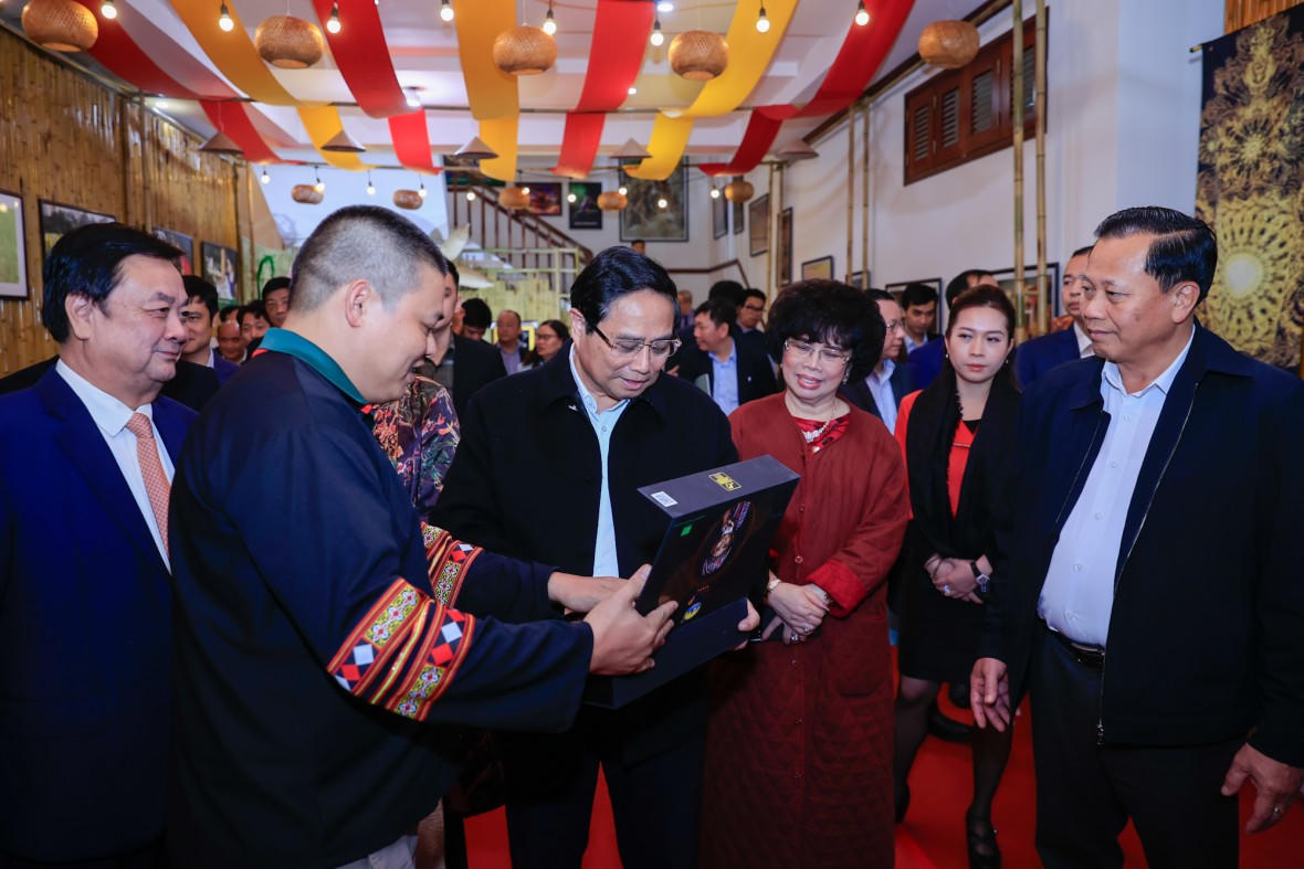 | Thủ tướng tham quan các gian hàng giới thiệu sản phẩm OCOP của ngành nông nghiệp và phát triển nông thôn trước khi tham dự Hội nghị - Ảnh: VGP |