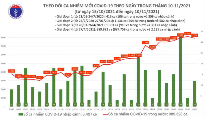 Tính từ 16h ngày 09/11 đến 16h ngày 10/11, trên Hệ thống Quốc gia quản lý ca bệnh COVID-19 ghi nhận 7.930 ca nhiễm mới, trong đó 12 ca nhập cảnh và 7.918 ca ghi nhận trong nước (giảm 211 ca so với ngày trước đó) tại 59 tỉnh, thành phố (có 3.999 ca trong cộng đồng).