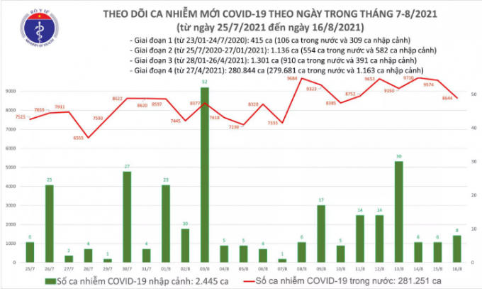 Cụ thể ngày 16/8 (từ 18h ngày 15/8 đến 18h ngày 16/8 ) cả nước ghi nhận 8.644 ca nhiễm Covid-19 mới. Trong đó 08 ca nhập cảnh và 8.644 ca được ghi nhận trong nước.