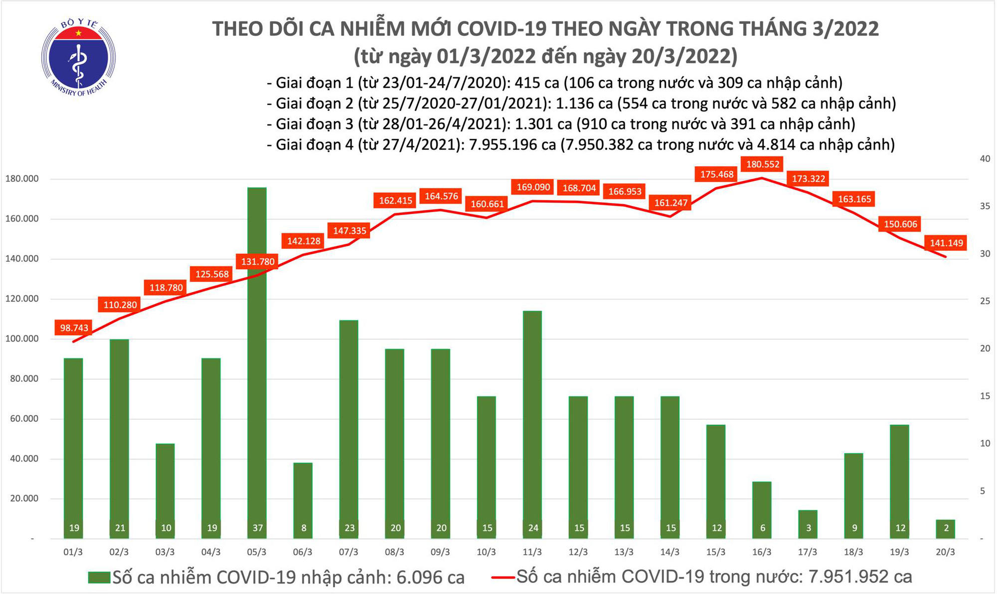 Bản tin phòng chống dịch COVID-19 chiều ngày 20/3 của Bộ Y tế cho biết, số ca mắc mới COVID-19 tiếp tục giảm so với hôm qua, còn 141.151 ca; Vĩnh Phúc bổ sung hơn 25.000 F0; trong ngày có hơn 111.600 bệnh nhân khỏi; 63 ca tử vong.