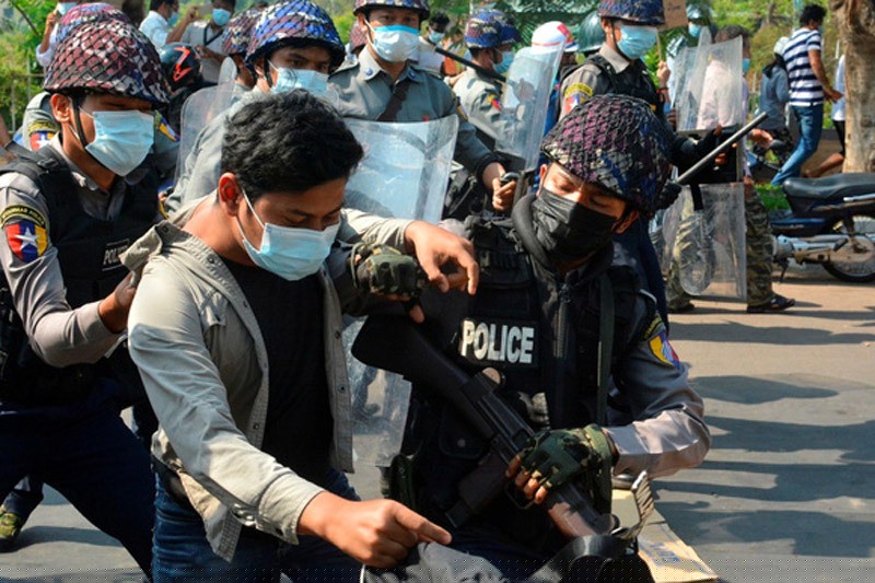 Cảnh sát Myanmarbắt giữ một người biểu tình phản đối đảo chính.