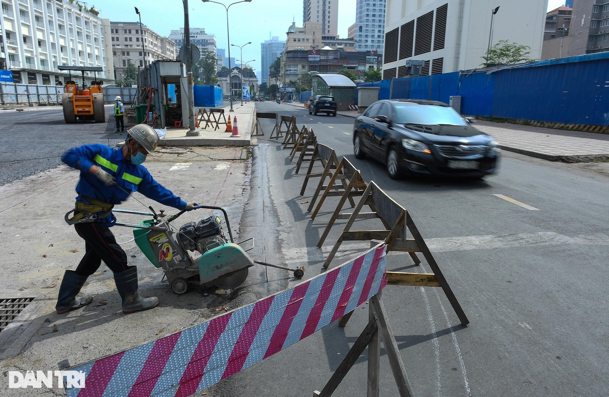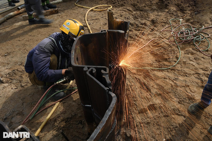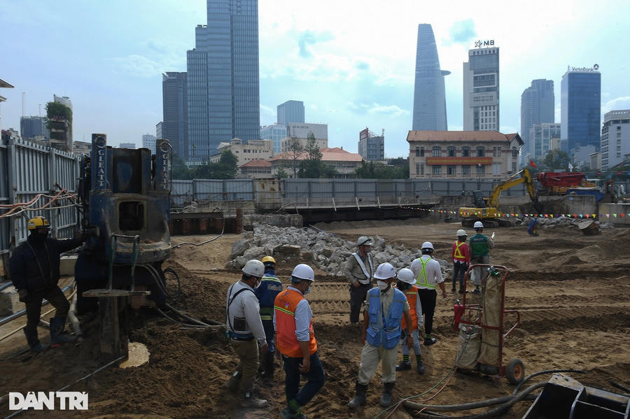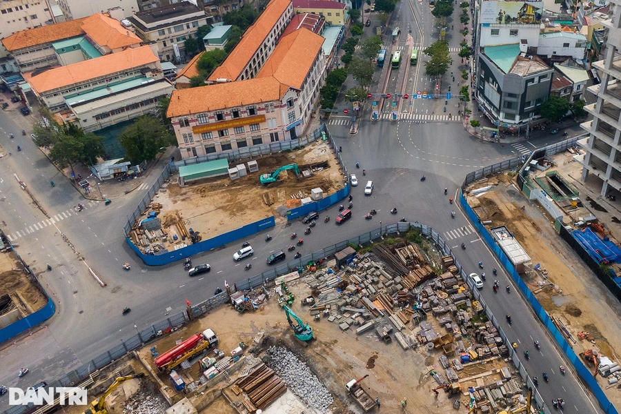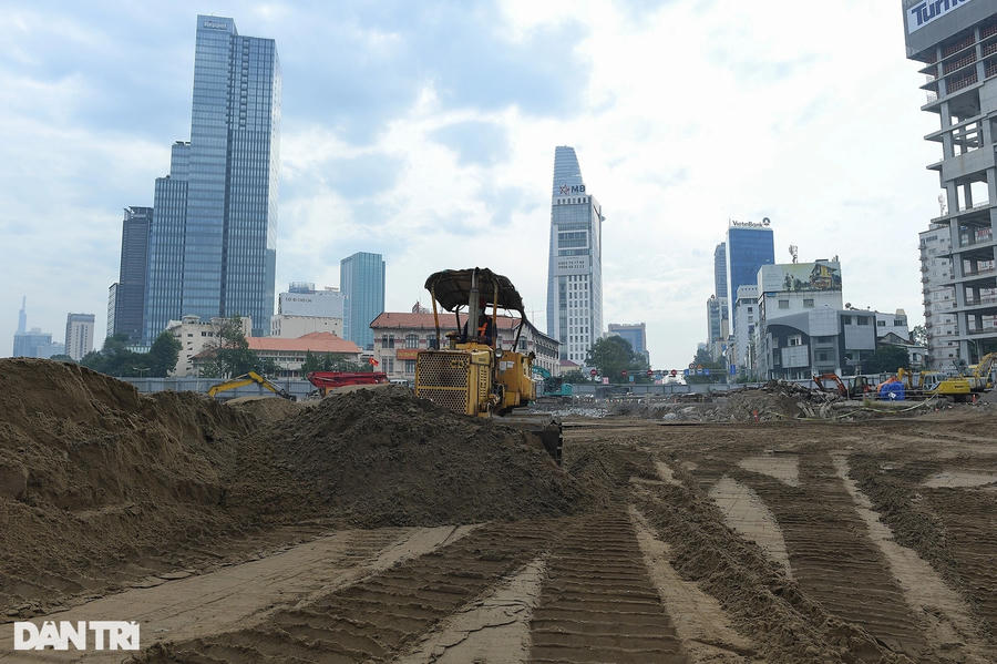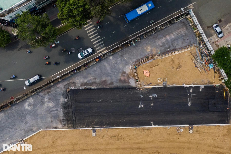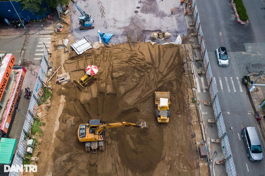 Trên công trường, xe lu hoạt động liên tục, san ủi đất cát để gia cố mặt bằng đường. Trước đó, các hạng mục như ngầm hóa tuyến metro, lắp đặt đường ống thoát nước, cắt tường vây... được thực hiện.