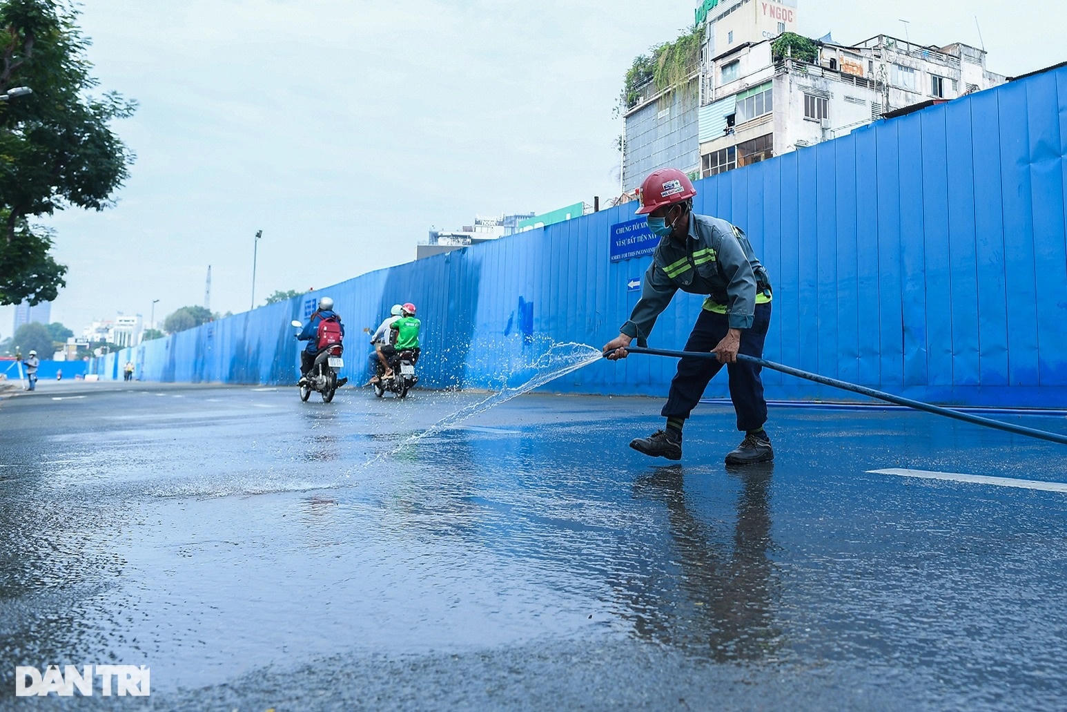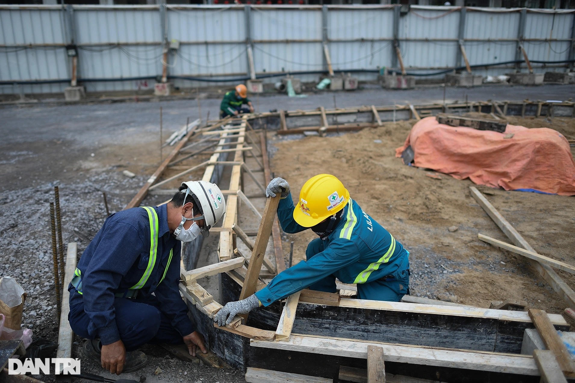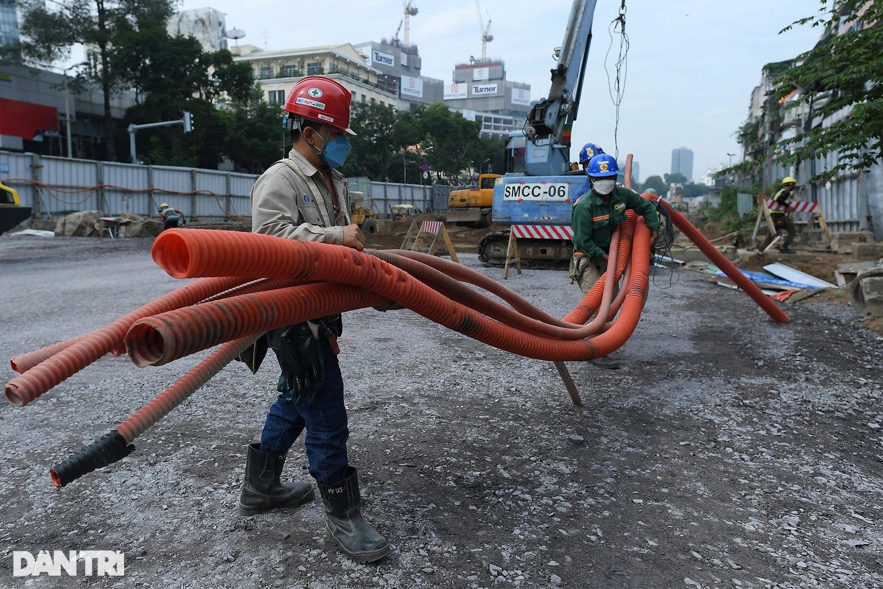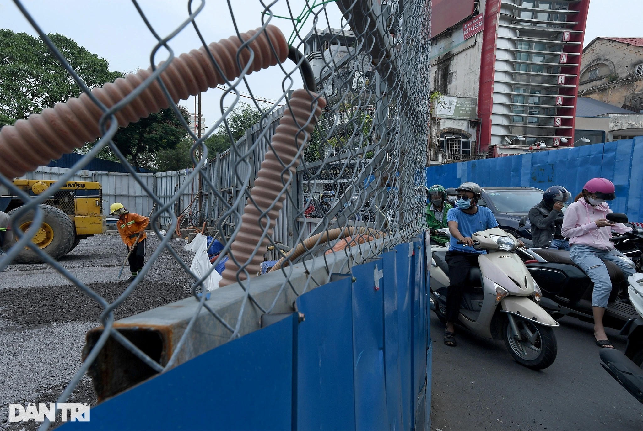 Trên công trường, xe lu hoạt động liên tục, san ủi đất cát để gia cố mặt bằng đường. Trước đó, các hạng mục như ngầm hóa tuyến metro, lắp đặt đường ống thoát nước, cắt tường vây... được thực hiện.