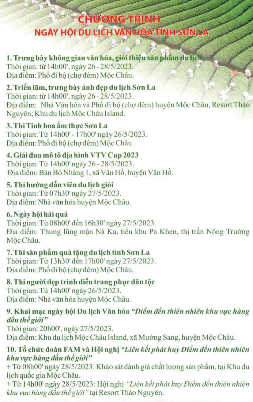 Theo đó, ngày hội Du lịch Văn hóa tỉnh Sơn La “Điểm đến thiên nhiên khu vực hàng đầu thế giới” sẽ diễn ra từ ngày 26 – 28/5 tại Khu du lịch quốc gia Mộc Châu.