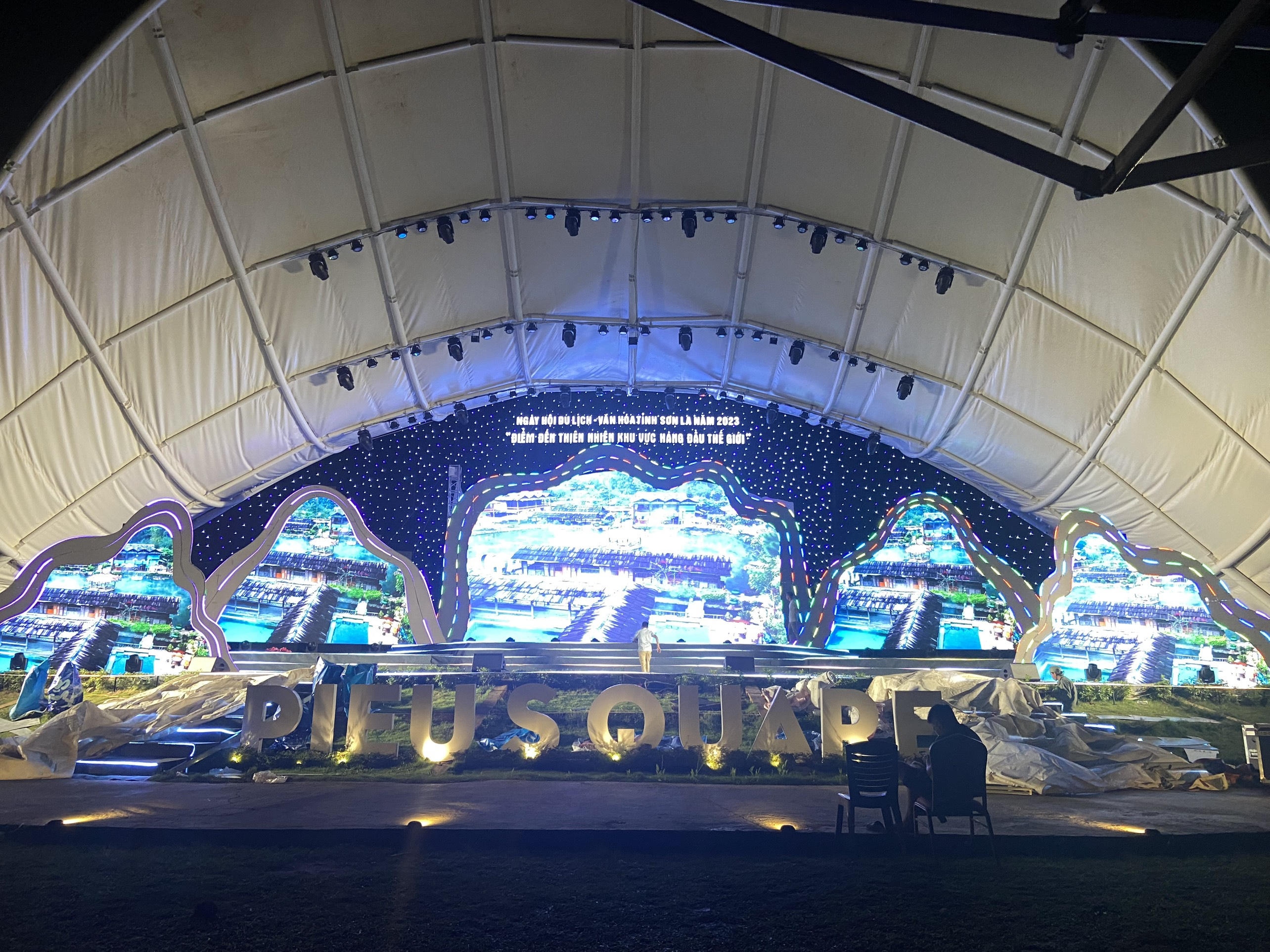 Sân khấu hoành tráng được dàn dựng công phu tại tổ hợp nghỉ dưỡng Mộc Châu Island phục vụ cho Lễ khai mạc Ngày hội Du lịch Văn hoá tỉnh Sơn La.