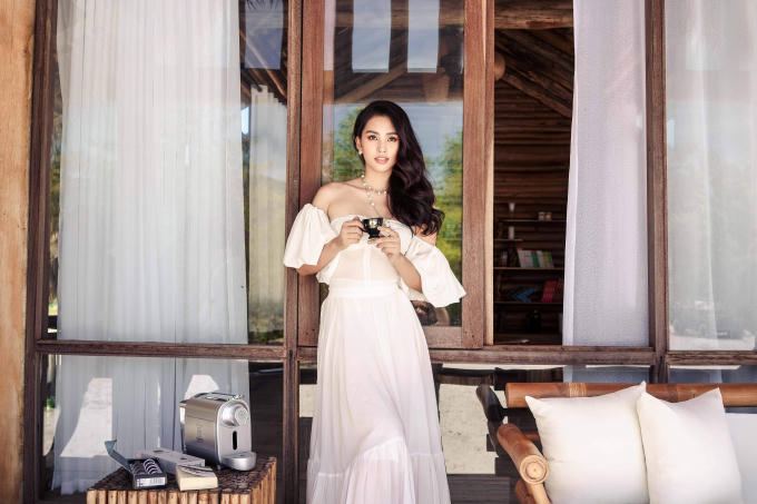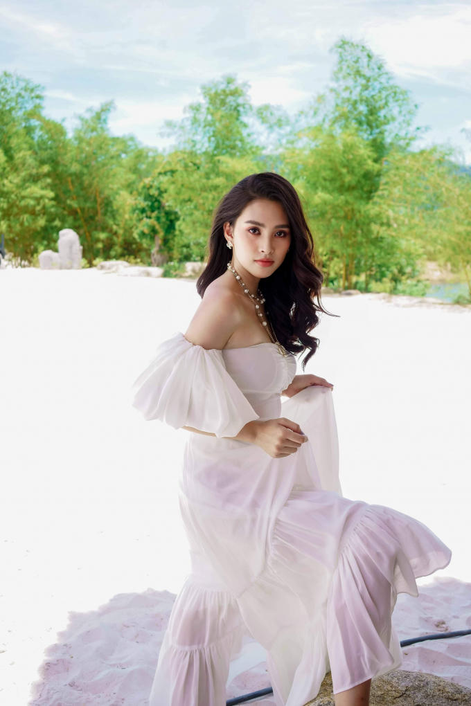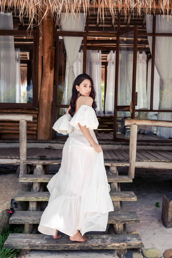 Trong bộ ảnh, Tiểu Vy như hóa nàng thơ với gương mặt xinh đẹp, vóc dáng gợi cảm, buông lơi vai trần trong bộ đầm maxi trắng tinh khôi.