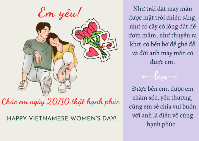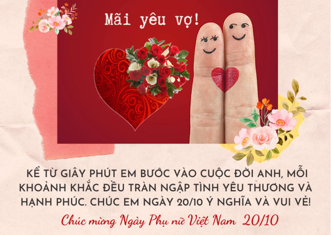 Em yêu à, nhân ngày 20/10, anh muốn gửi tới vợ những gì cao quý và thiêng liêng nhất. Cảm ơn em đã cùng đồng hành và cùng anh vượt qua mọi khó khăn thử thách. Anh hứa sẽ yêu thương và bù đắp cho em cả cuộc đời này!