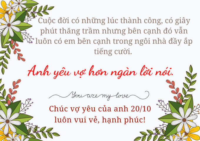 Cảm ơn em vì đã là hậu phương vững chắc cho anh trong suốt thời gian vừa qua. Hạnh phúc lớn nhất của anh là có em làm vợ. Chúc em một ngày 20/10 thật ý nghĩa nhé.