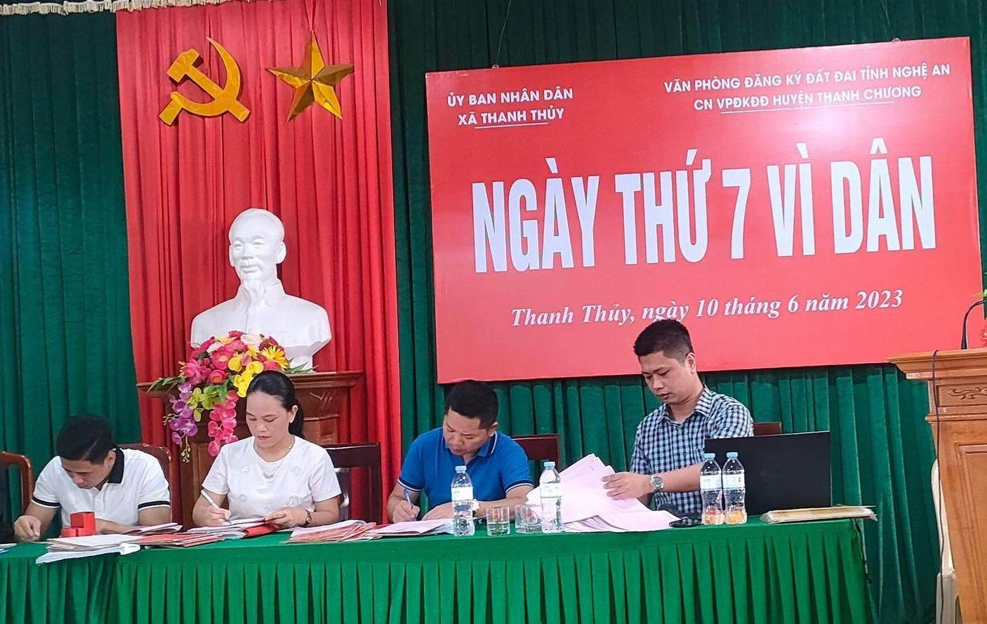 Còn tại xã Thanh Thủy (Thanh Chương - Nghệ An), các cán bộ xã cùng nhiều cán bộ văn phòng đăng ký quyền sử dụng đất huyện Thanh Chương đã tiếp nhận, xử lý nhiều trường hợp liên quan đến mảng đất đai để giải quyết. Riêng trong ngày thứ 7, ngày 10/6/2023 theo kế hoạch xã cấp trả cho người dân 270 giấy chứng nhận, nâng tổng số cấp trả trong 2 đợt lên tới 500 GCNQSDĐ.