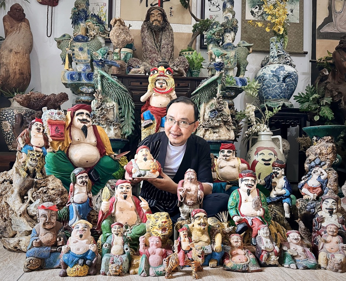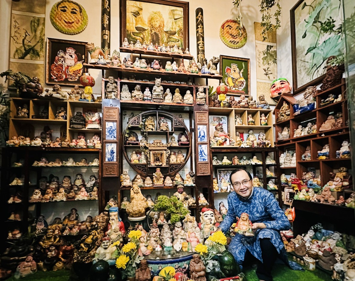 | Thạc sĩ Nguyễn Hiếu Tín trong "vương quốc" Ông Địa được bản thân dày công sưu tầm. |