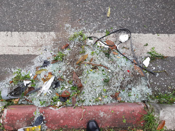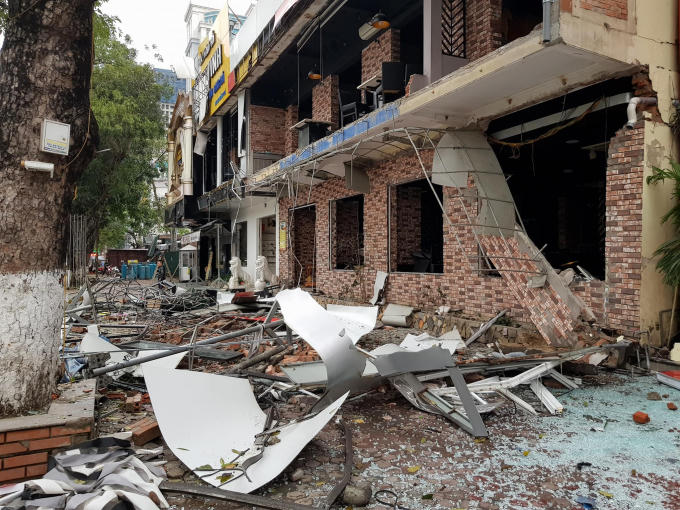 Áp lực từ vụ nổ kinh hoàng khiến một phần tường của căn tòa nhà 2 tầng bị sập, cửa kính của nhiều nhà bên kia đường cũng vỡ vụn.