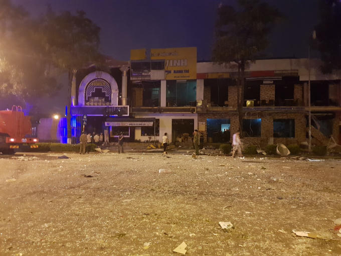 Một khung cảnh tan hoang tại hiện trường vụ nổ. Biển quảng cáo, một phần tường của tòa nhà 2 tầng bị đổ sập, áp lực từ vụ nổ khiến kính của căn nhà phía bên kia đường cũng vỡ vụn. Nhiều bình ga công nghiệp cỡ lớn được đưa ra khỏi hiện trường.