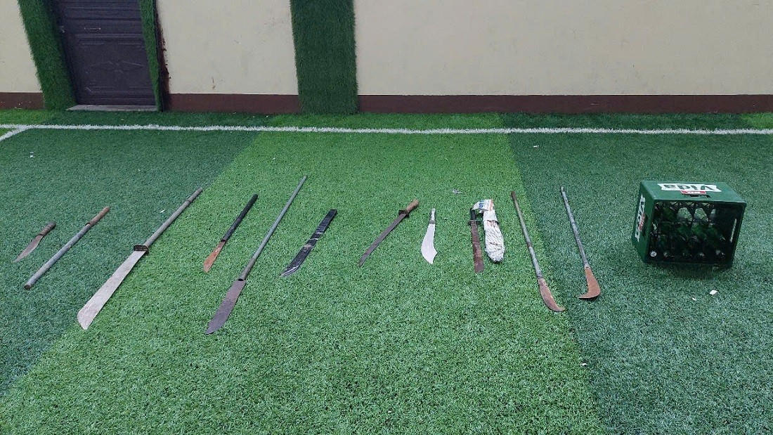 Tại hiện trường, cơ quan chức năng thu giữ tang vật gồm: 8 xe máy, 8 dao, kiếm, 1 gậy sắt, 1 két vỏ chai bia.