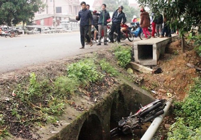 Tại hiện trường, thi thể người phụ nữ trẻ tuổi vẫn đội mũ bảo hiểm cùng chiếc xe máy mang BKS 37N2 - 9654 nằm giữa mương nước.