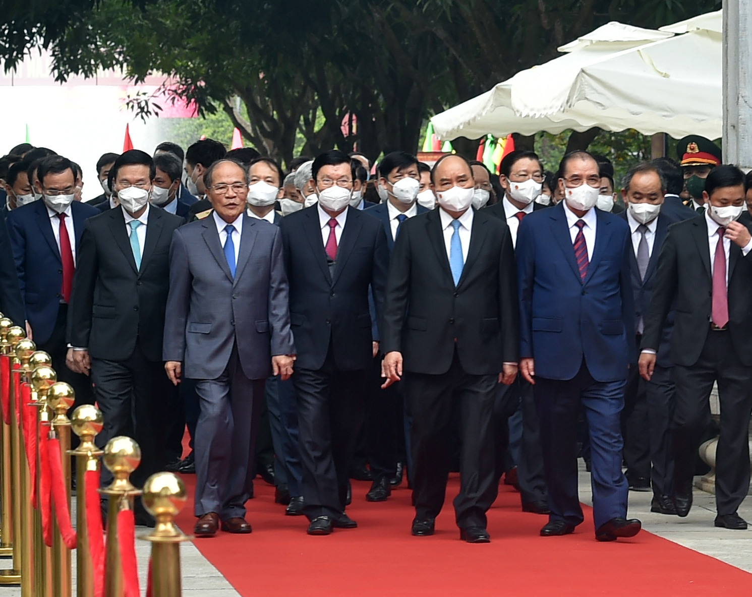 | Chủ tịch nước Nguyễn Xuân Phúc và các đồng chí lãnh đạo, nguyên lãnh đạo Đảng và Nhà đến dự lễ kỷ niệm - Ảnh VGP/Đức Tuân |