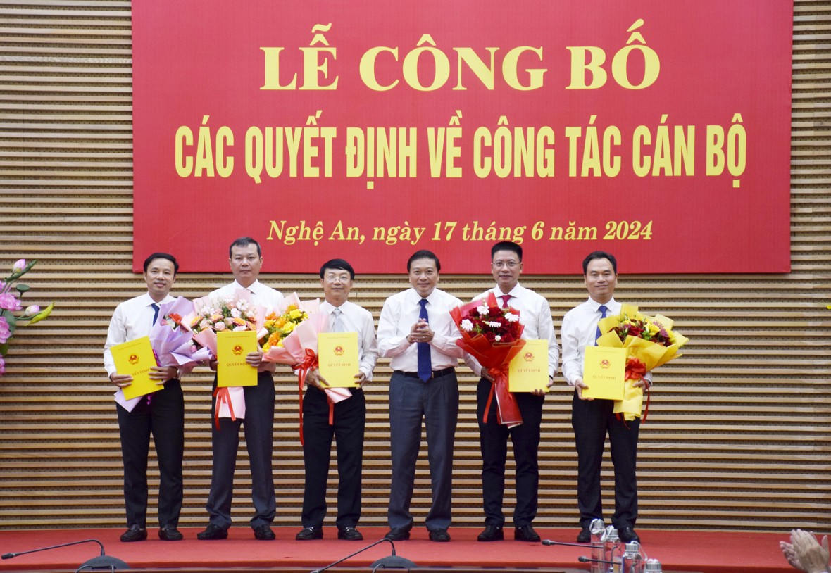 Chiều 17/6, thực hiện Quy định số 11-QĐ/TU ngày 02/12/2021 của Ban Thường vụ Tỉnh uỷ Nghệ An, UBND tỉnh Nghệ An tổ chức Lễ công bố các Quyết định của Chủ tịch UBND tỉnh về công tác cán bộ.