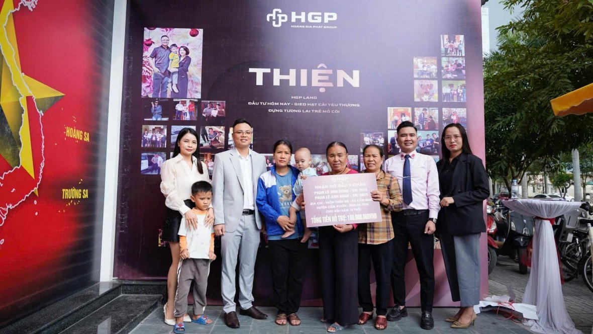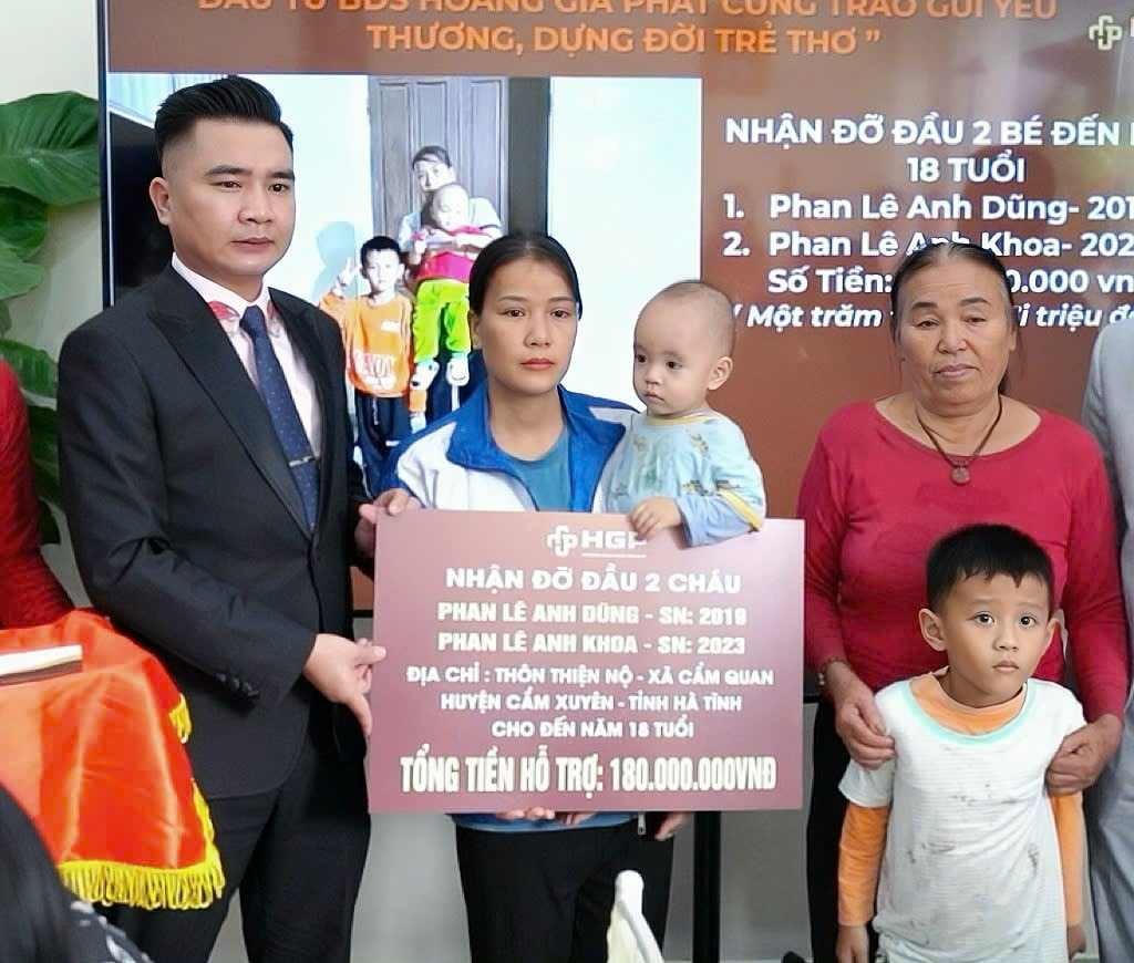 Quá trình tìm hiểu đầu tư tại huyện Cẩm Xuyên, Công ty CP Đầu tư và Thương mại Hoàng Gia Phát nắm bắt được hoàn cảnh gia đình chị Lê Thị Mỹ nên quyết định nhận đỡ đầu hai cháu: Phan Lê Anh Dũng (SN 2019) và Phan Lê Anh Khoa (SN 2023) với mức hỗ trợ 500.000 đồng/cháu/tháng.