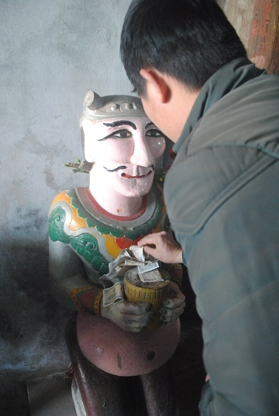 | Dù Ban quản lý di tích đền Cờn đã có quy định không bỏ tiền ở các pho tượng nhưng hình ảnh này vẫn xuất hiện ở nhiều nơi trong đền Cờn (ảnh Duy Ngợi). |