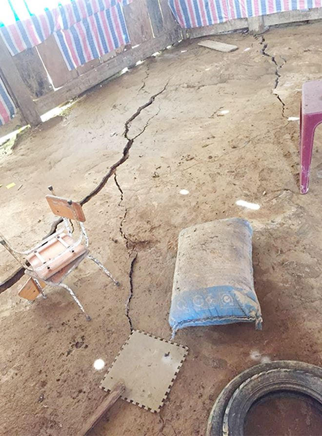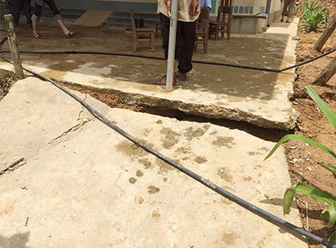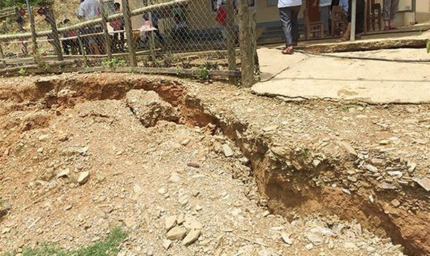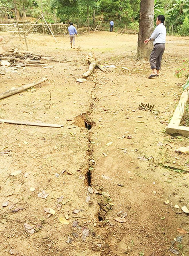 Theo ông Hợi, tại hiện trường, có 6 vết nứt chạy ngang dãy trường tiểu học, vết nứt trung bình dài khoảng 60m, chiều rộng chỗ rộng nhất khoảng 20cm. Nguy hiểm nhất là vết nứt chạy theo hình bán nguyệt phía trên của khuôn viên điểm trường tiểu học, sát cổng trường mầm non, qua nhà ký túc xá của giáo viên và nhà văn hóa cộng đồng bản, chiều dài của vết nứt, sụt lún khoảng 800m.