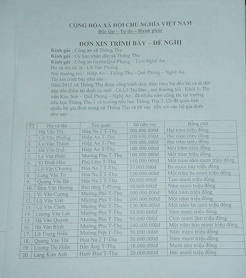 | Danh sách người dân cho bà Lô Thị Đào vay tiền. |